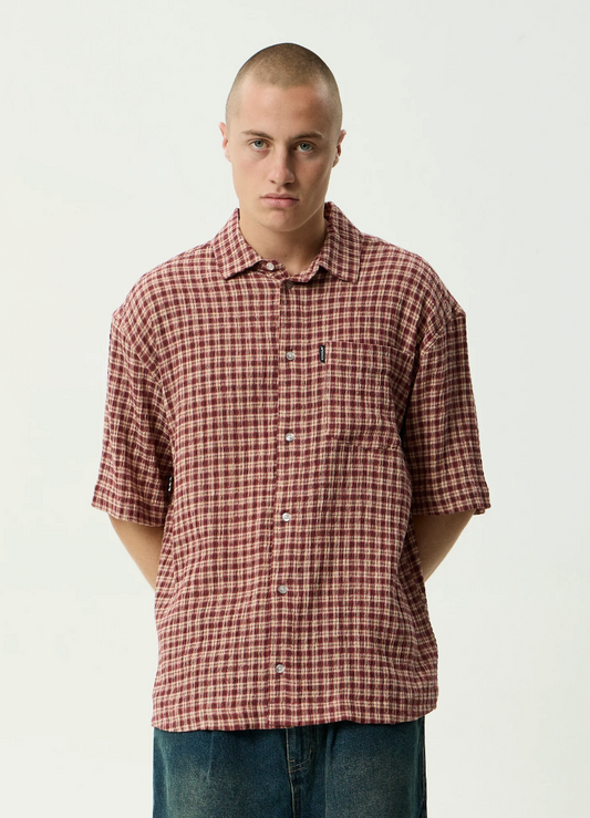 Capricorn - Seersucker Short Sleeve Shirt - Burgundy / Beige Check