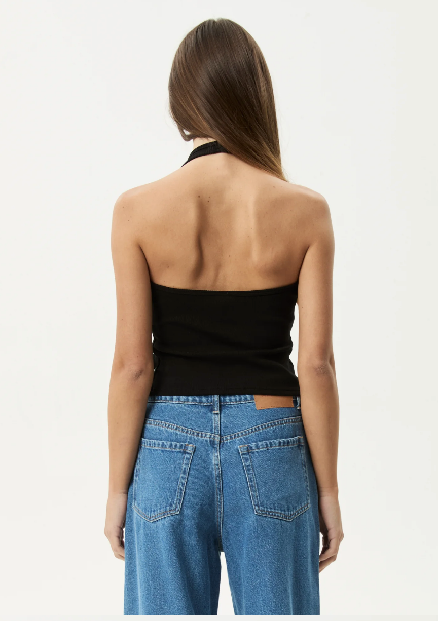 The 'Basis' halter top offers a sleek, tight fit with a scooped neckline and textured rib fabric. Crafted from a durable blend of organic and recycled cotton with a touch of spandex, its built to last while delivering a premium feel.